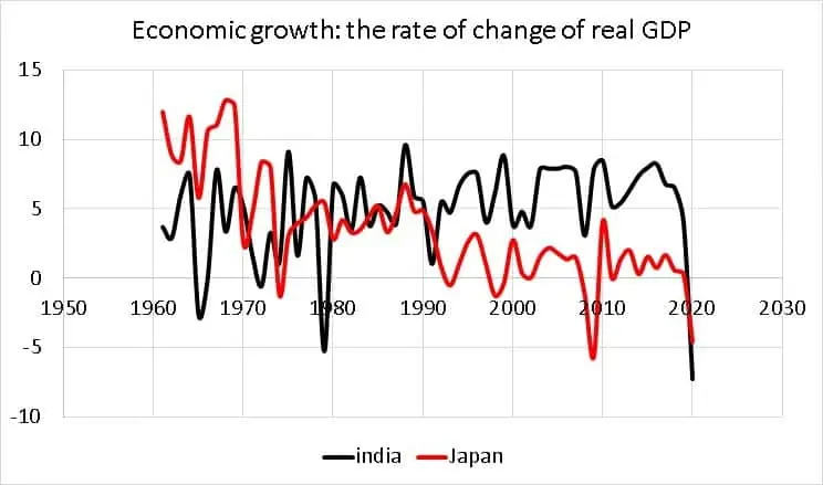 Excluding the consequence of the pandemic, the Indian GDP has been growing at a reasonable pace. The fall in the Japanese GDP growth rate is obvious.
