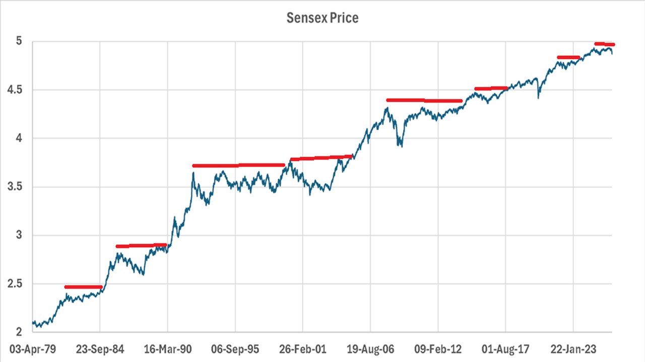 Each 0.5 graduation is a 3.16X increase in the Sensex price or a 216% increase. See Why are stock market graphs plotted in logarithmic scale?