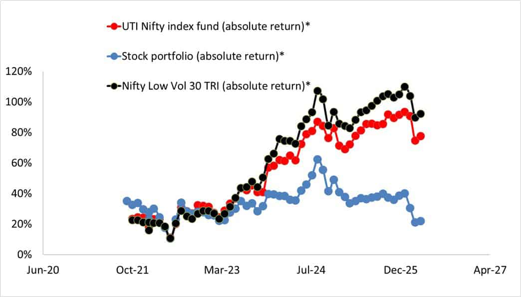 Absolute return of stock portfolio vs UTI Nifty Index Fund vs Nifty 100 Low Vol 30 TRI as of Apr 10th, 2026