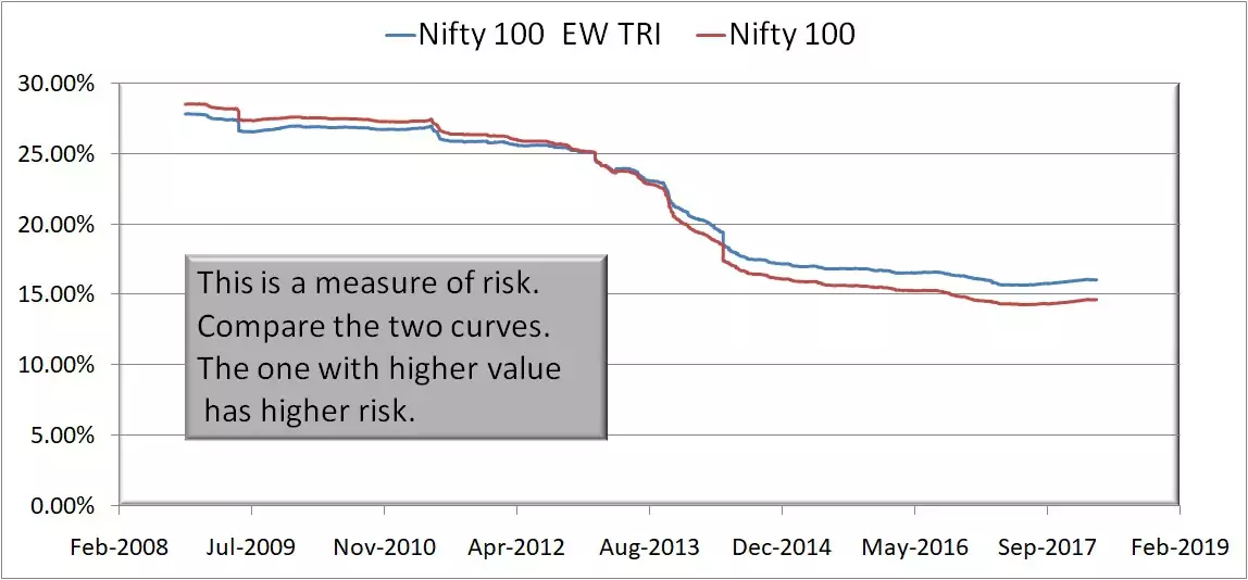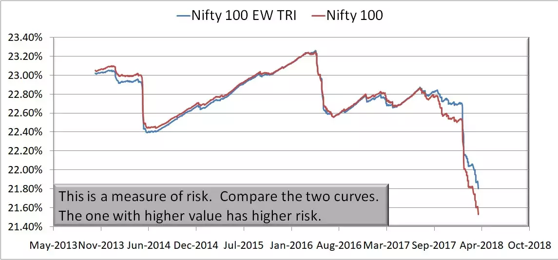 When the entire market tumbles down, then the N50EW quickly drops down close to N50. I am not convinced this is an attractive feature.  Also, notice that the EW50 volatility in the last few years seems to be higher.  Perhaps if there is a Nifty Next 50 (NN50) equal weight, I would consider it over the Nifty Next 50: The Benchmark Index That No Mutual Fund Would Touch!