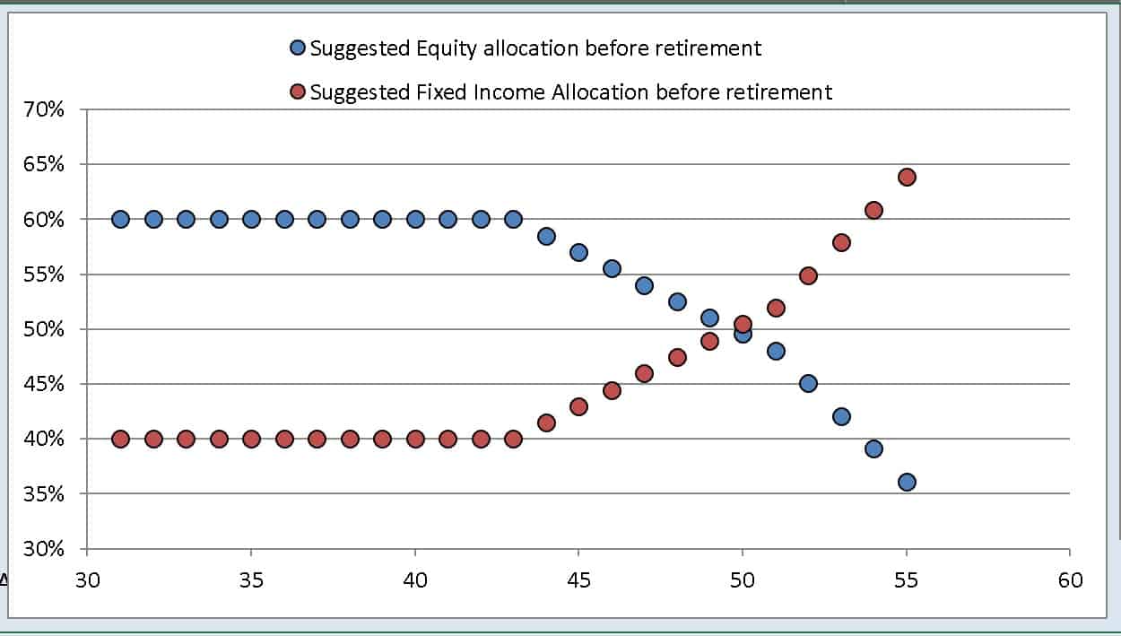Starting with 60% equity exposure, Chandran can gradually taper down to about 36% at retirement and maintain that.