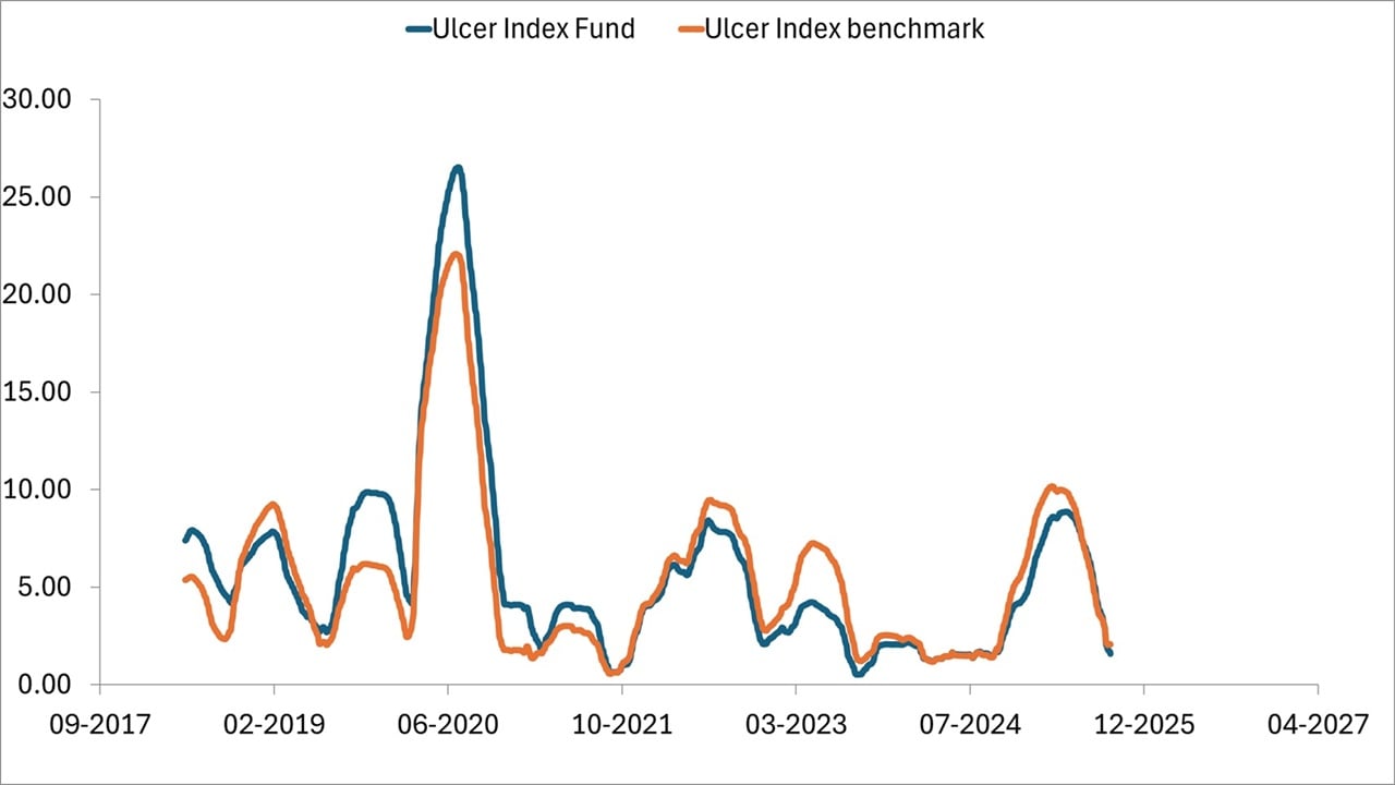 3 Ulcer Index outperformance consistency (aka Ulcer score). This is a 90-day rolling average of the Ulcer Index. This is a measure of how much the fund fell from a peak when compared to an index. You want the fund to fall lower than the index. A fund that shows this charecteristic consistently will have a high Ulcer Score. So we want high Ulcer scores – at least 60-70%. This is a typical graph used to compute the Ulcer score. In the graph, the high values corresponds to higher drawdowns and higher holding stress.