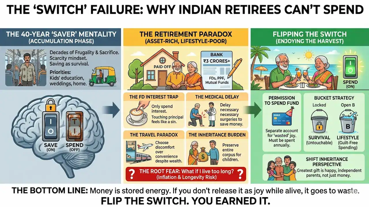 - The Inheritance Burden: A uniquely Indian pressure is the deep-seated belief that the entire corpus must be preserved for the children. They live like paupers so their 45-year-old, well-settled children can inherit a massive fortune later.